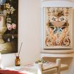 Parquet naturale, pareti bianche e quadri neri con fiori stilizzati definiscono uno spazio elegante e discreto.